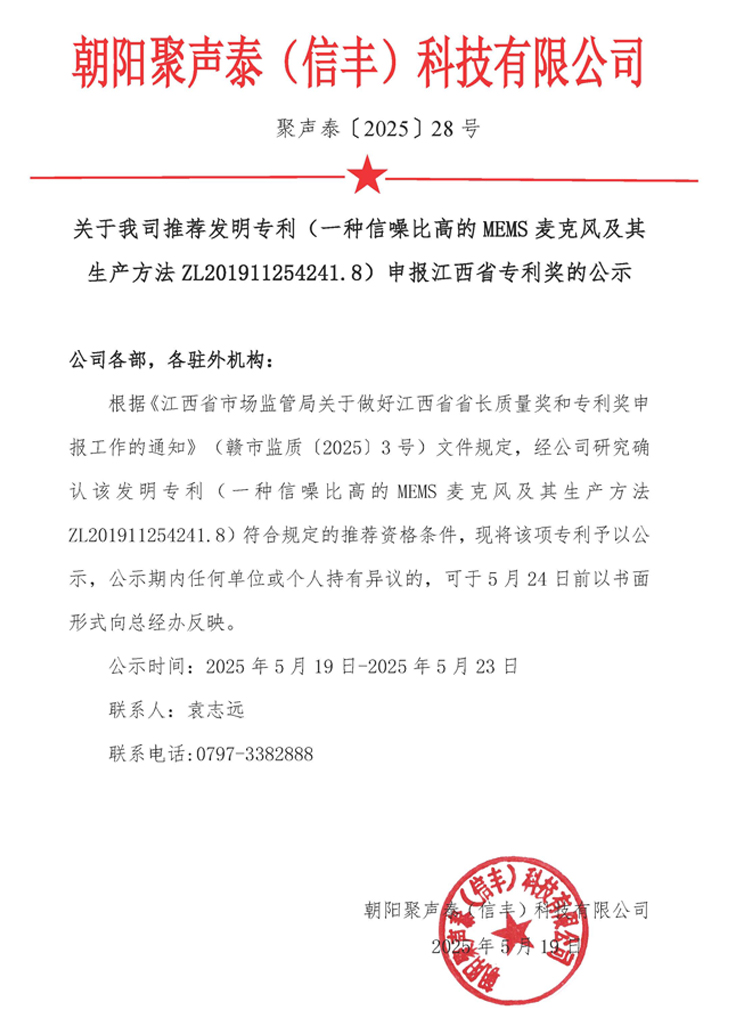 《一种信噪比高的mems麦克风及其生产方法》江西省专利奖的公示